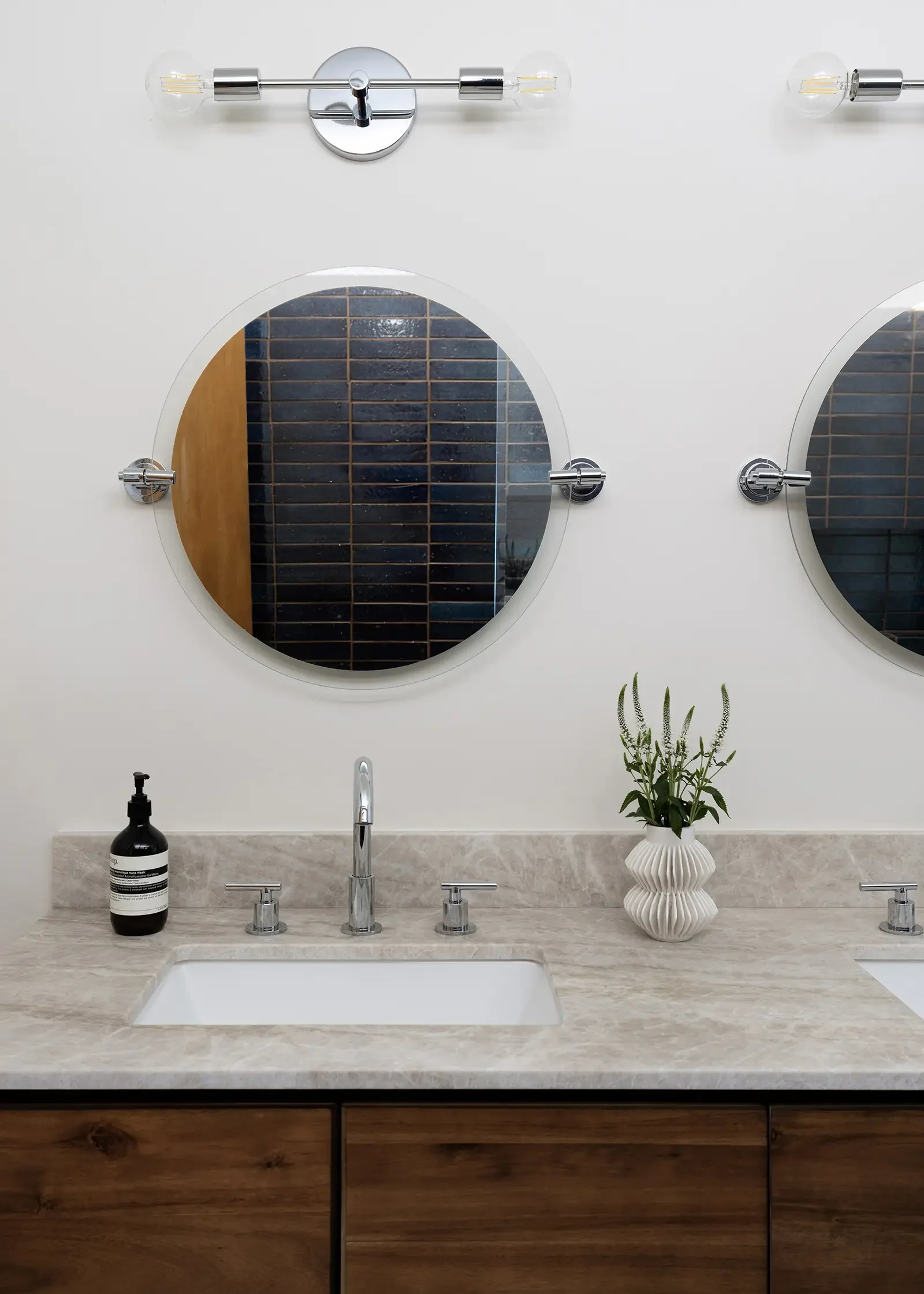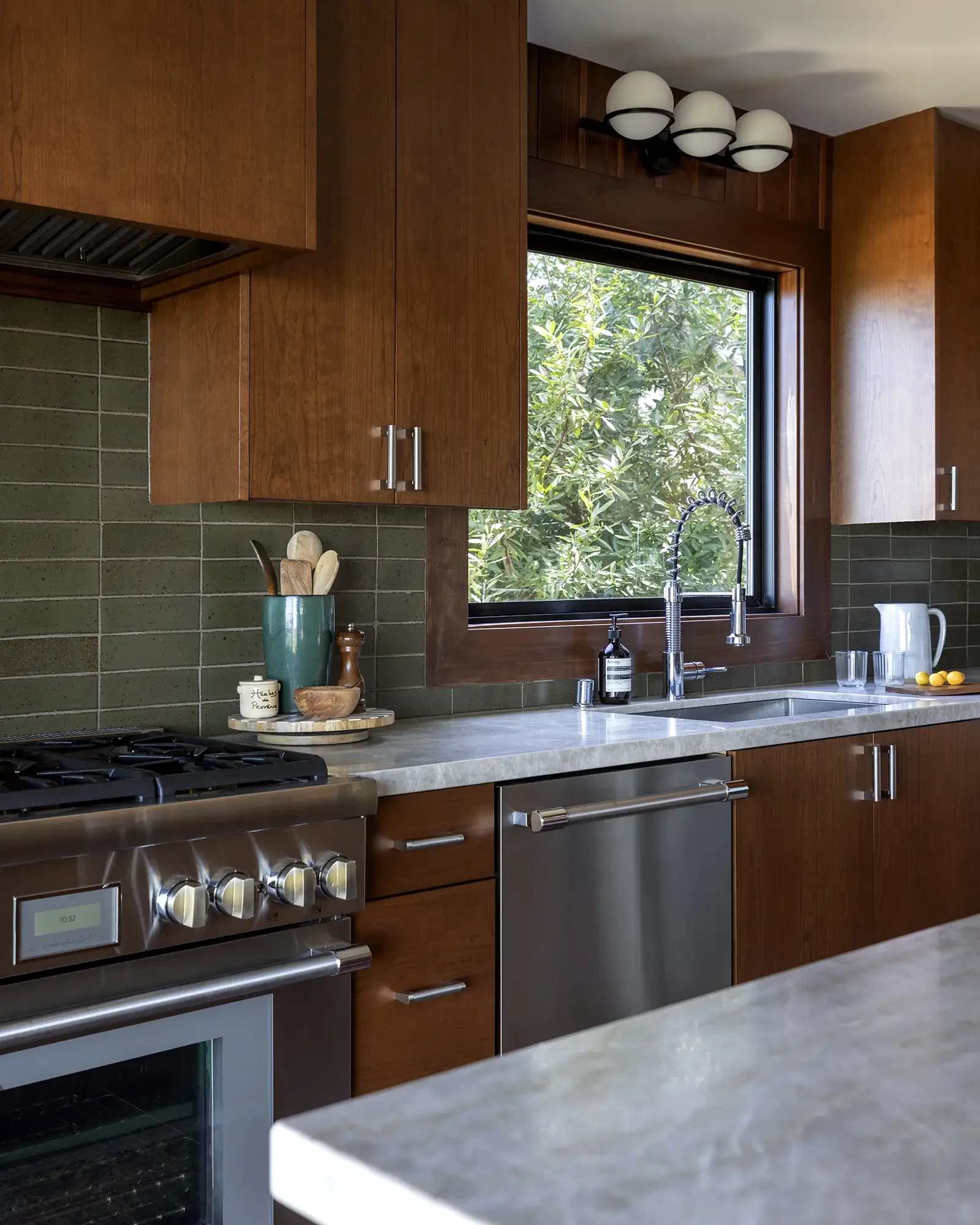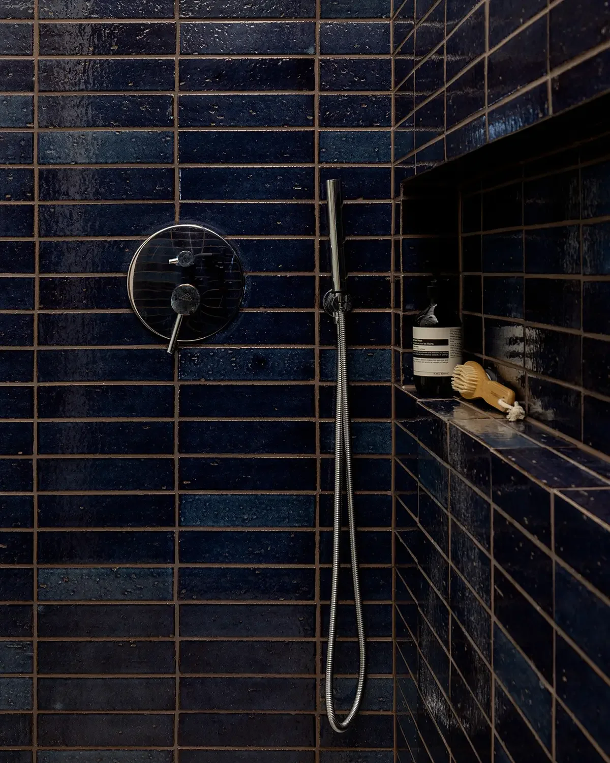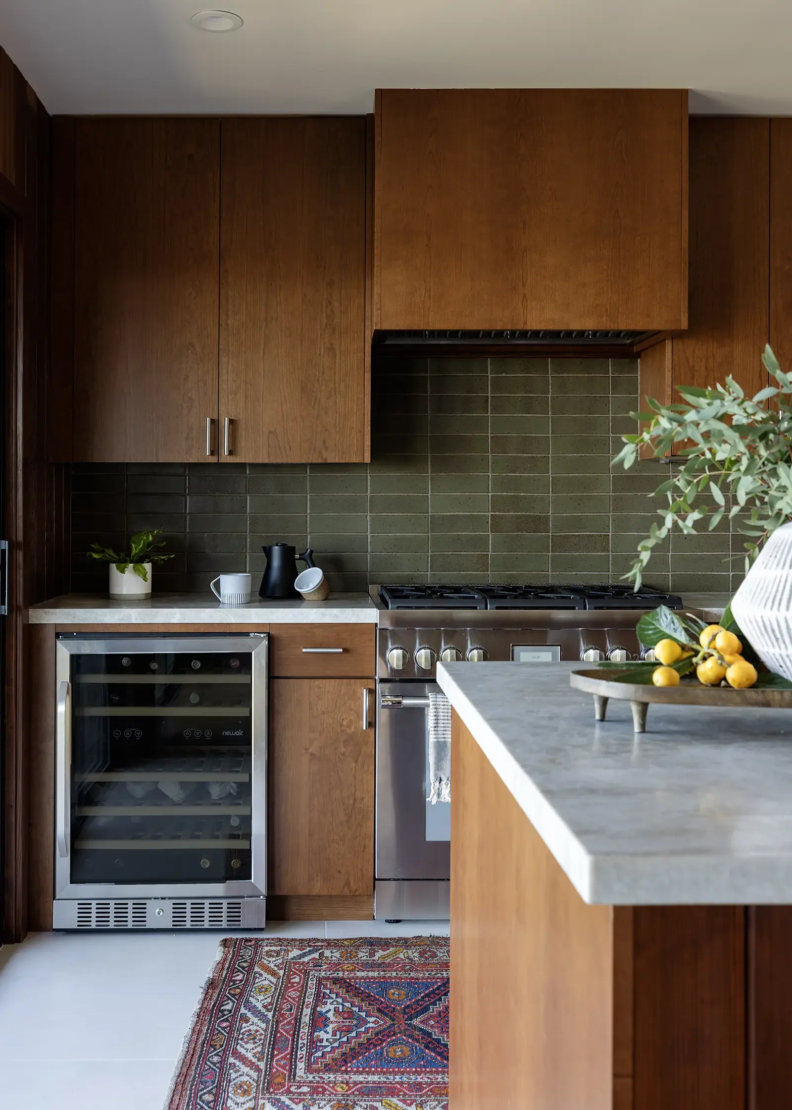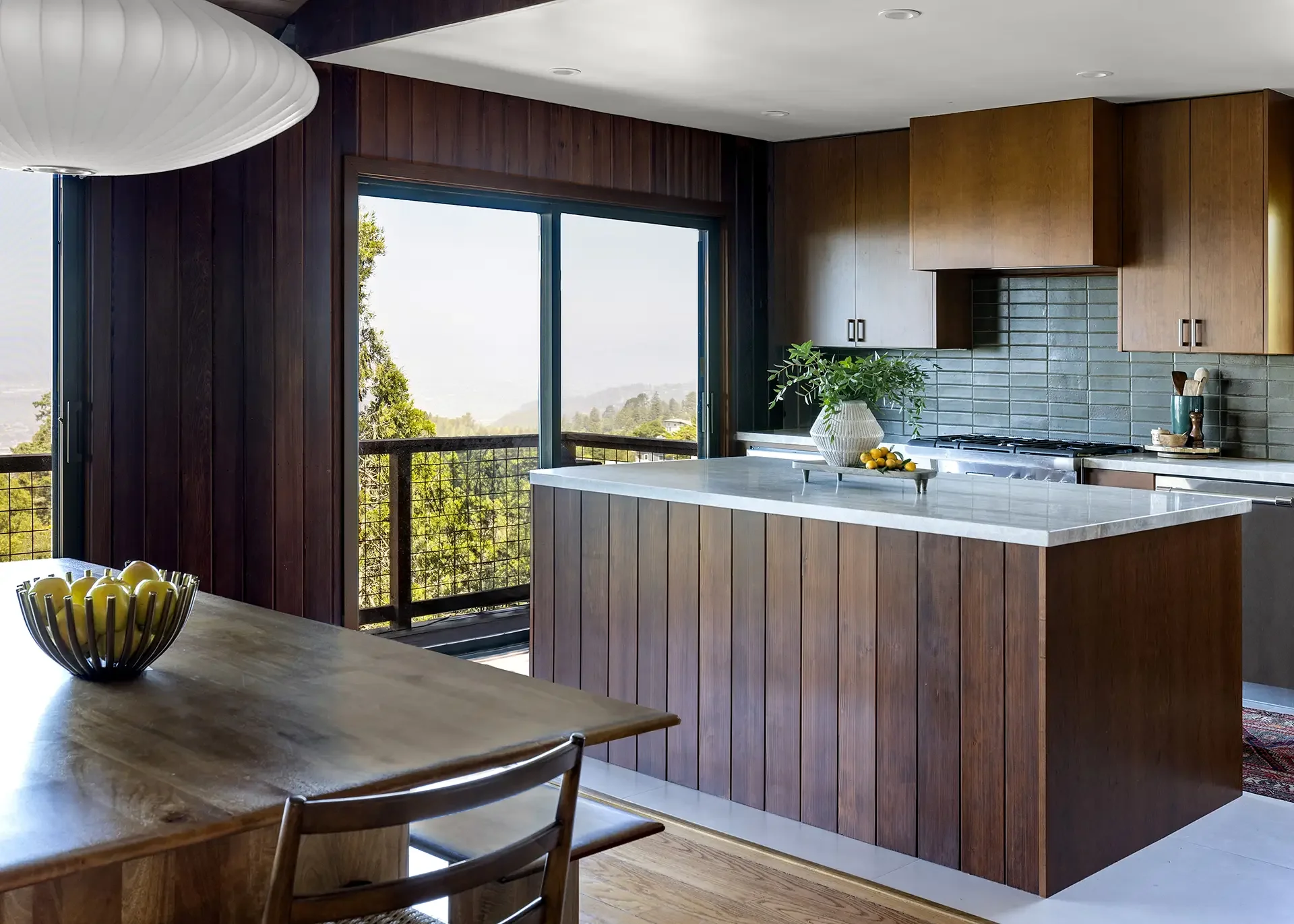 The interior service spaces, like bathrooms, are lined with deep blue tiles. Paired with the continuation of wooden decor and a green kitchen background, these spaces create a cohesive connection to nature while providing a spa-like atmosphere for both residents and guests.