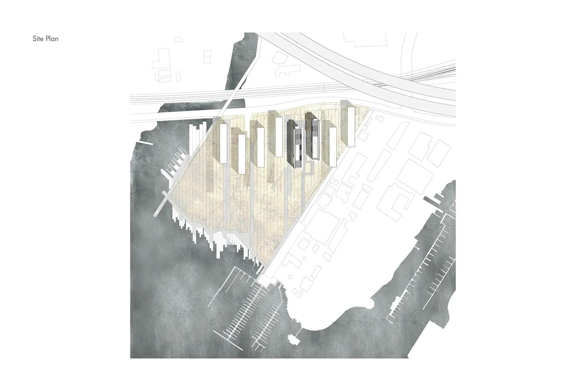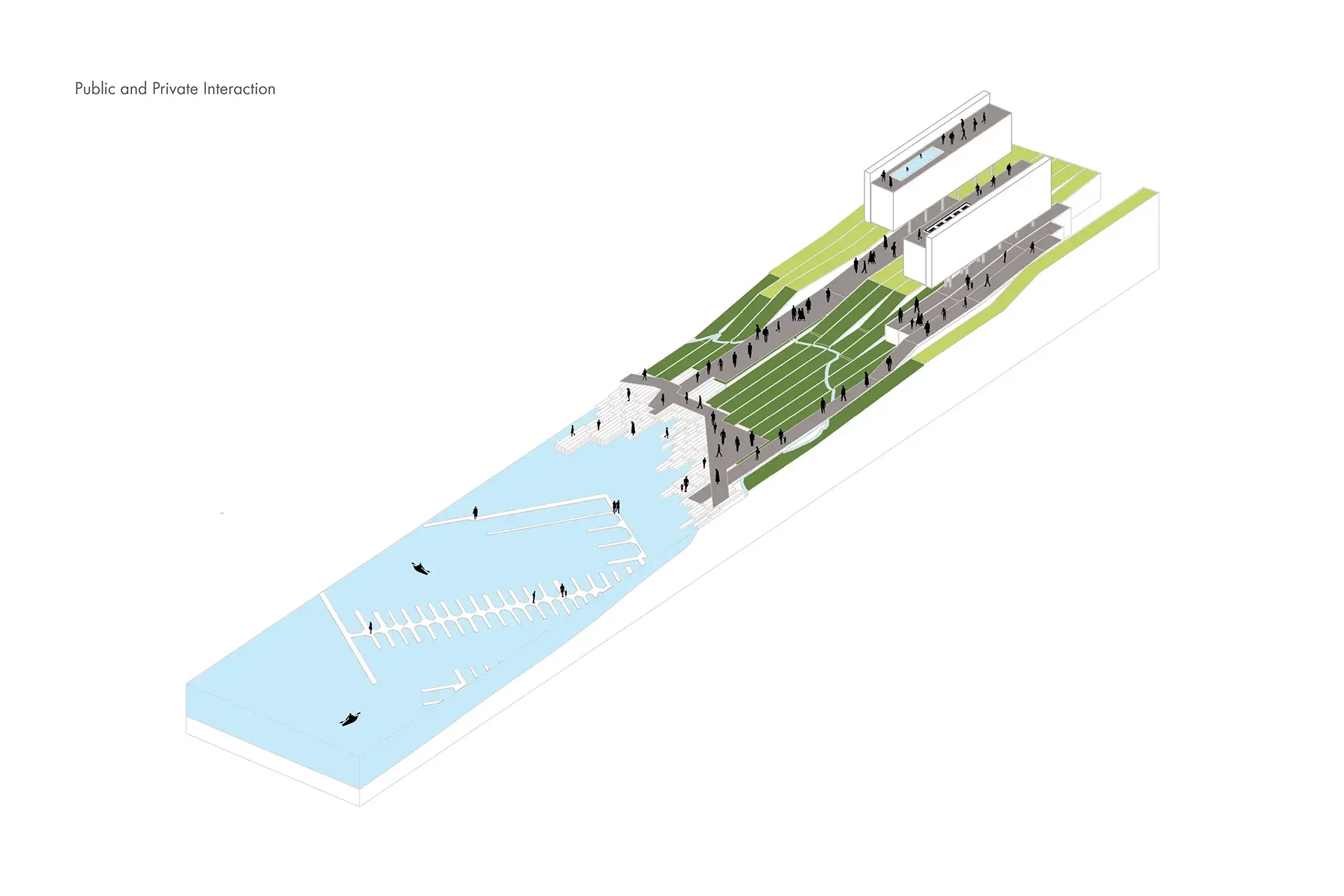 The architectural idea is a series of bar buildings facing each other, creating a courtyard between the buildings for the residents. The buildings face each other because as the site has a great views towards San Francisco and the bay it encourages residents and visitors to experience the landscape while enjoying the views outside. The landscape and views are intended to be used and seen at the landscape level in the courtyard and at the roof level at the public amenities. The public pathways lead out into the landscape on the opposite faces of the buildings. These pathways connect to the existing boat docks and pass under the 880 highway connecting with Lake Merritt.
