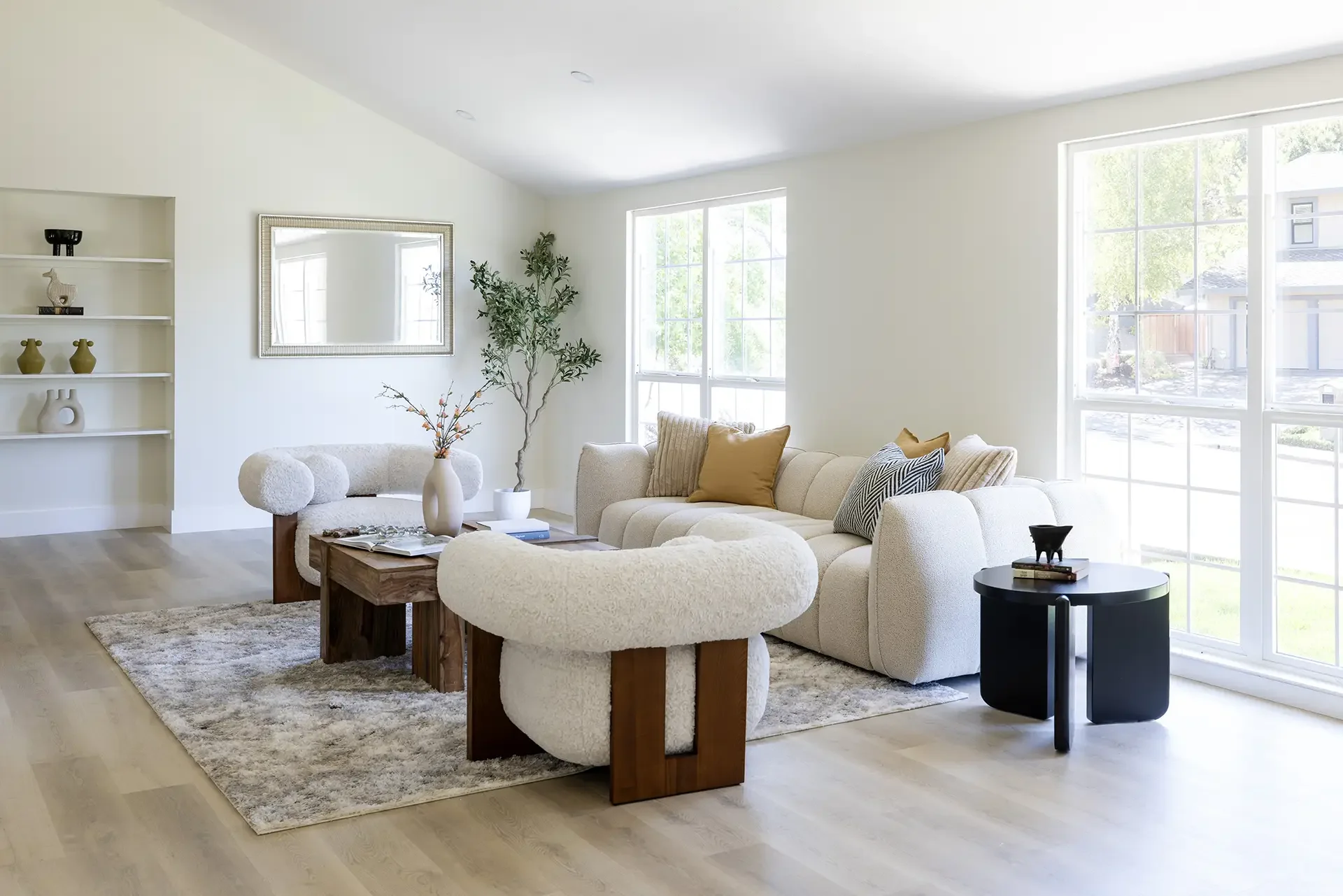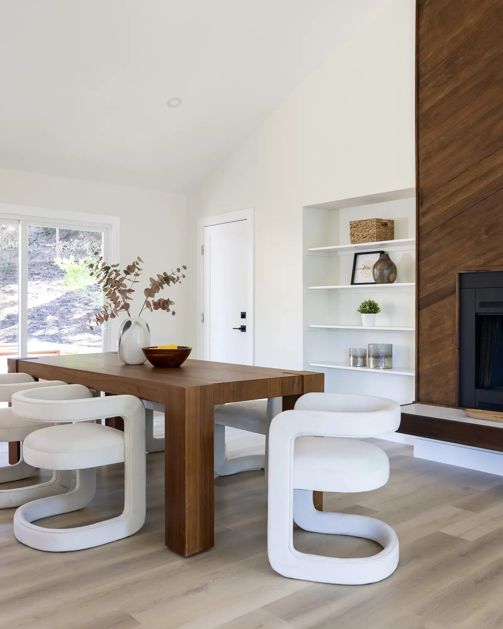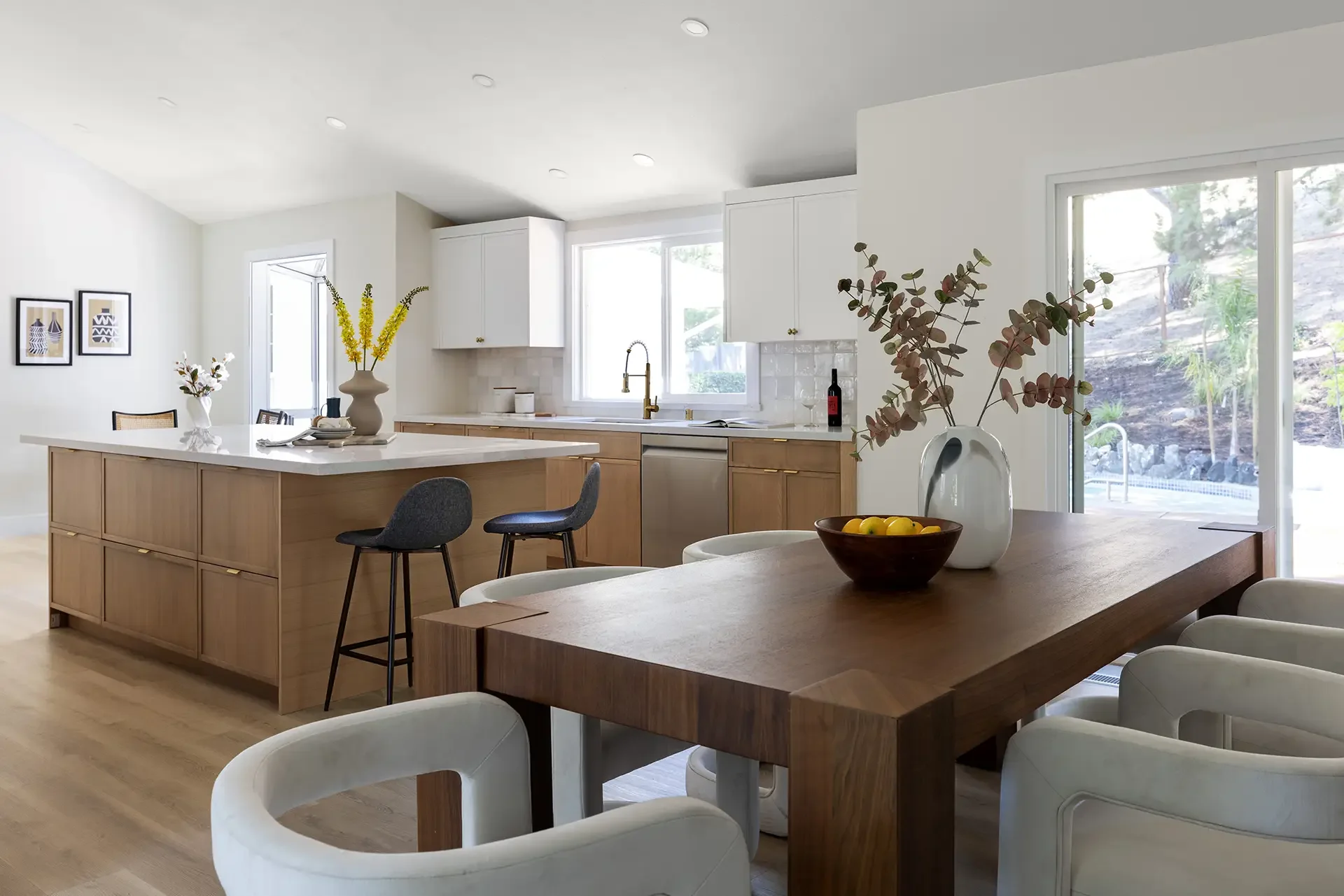 The remodel of this Moraga home blends midcentury charm with modern touches, focusing on an open-concept layout that connects the kitchen to the living areas. The kitchen, filled with natural light, features sleek cabinetry and a central island that serves as a gathering space for cooking and entertaining. Subtle nods to the midcentury, such as earthy tones and organic shapes, bring a sense of nostalgia to the otherwise contemporary design.