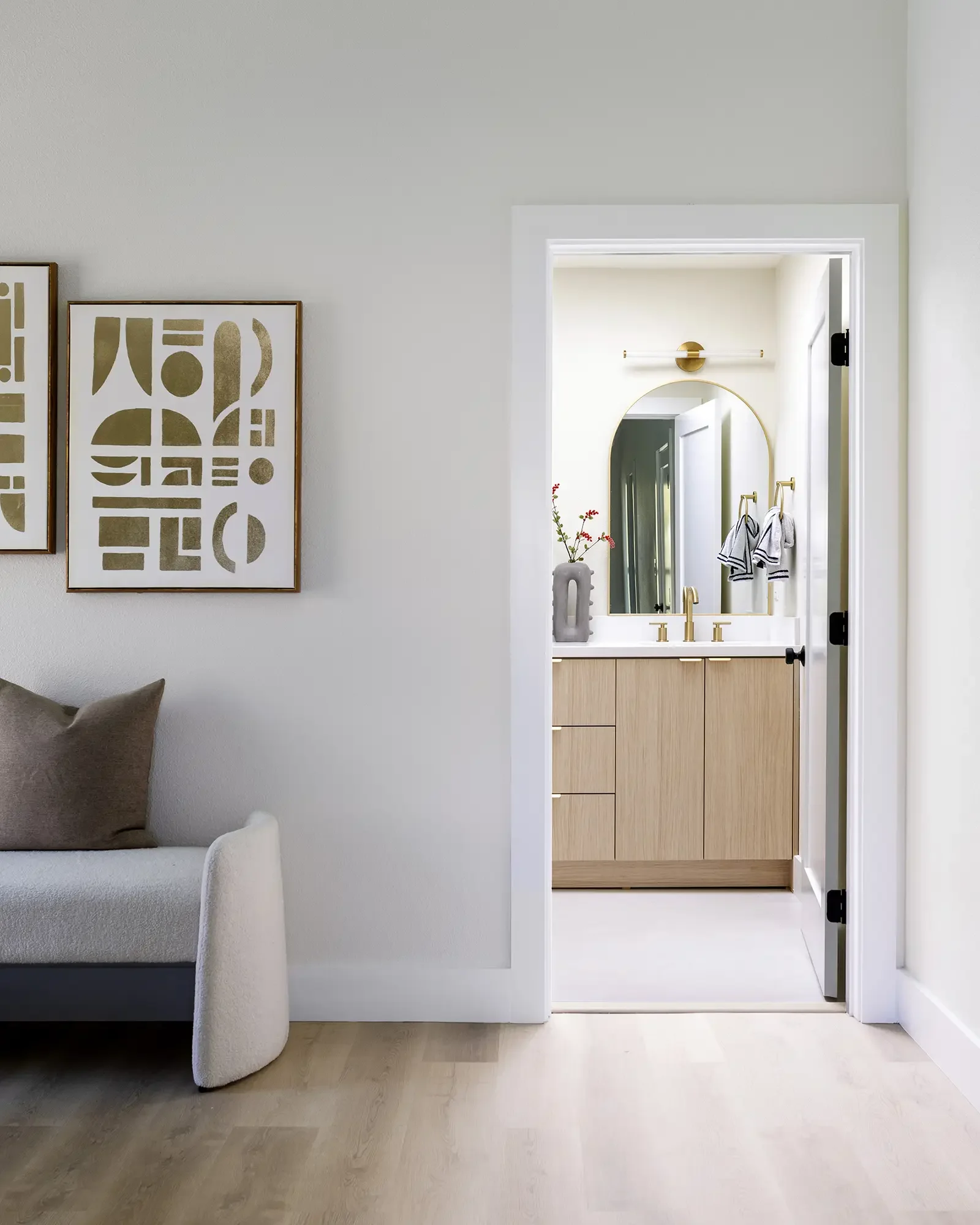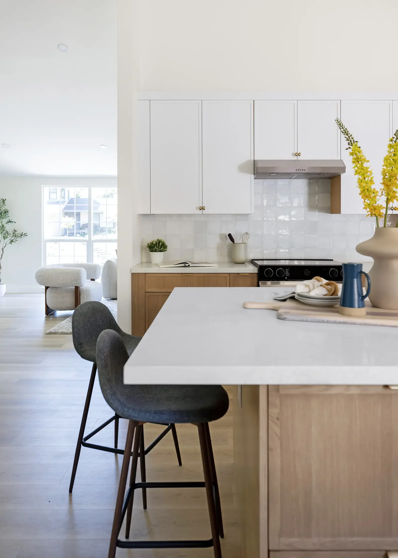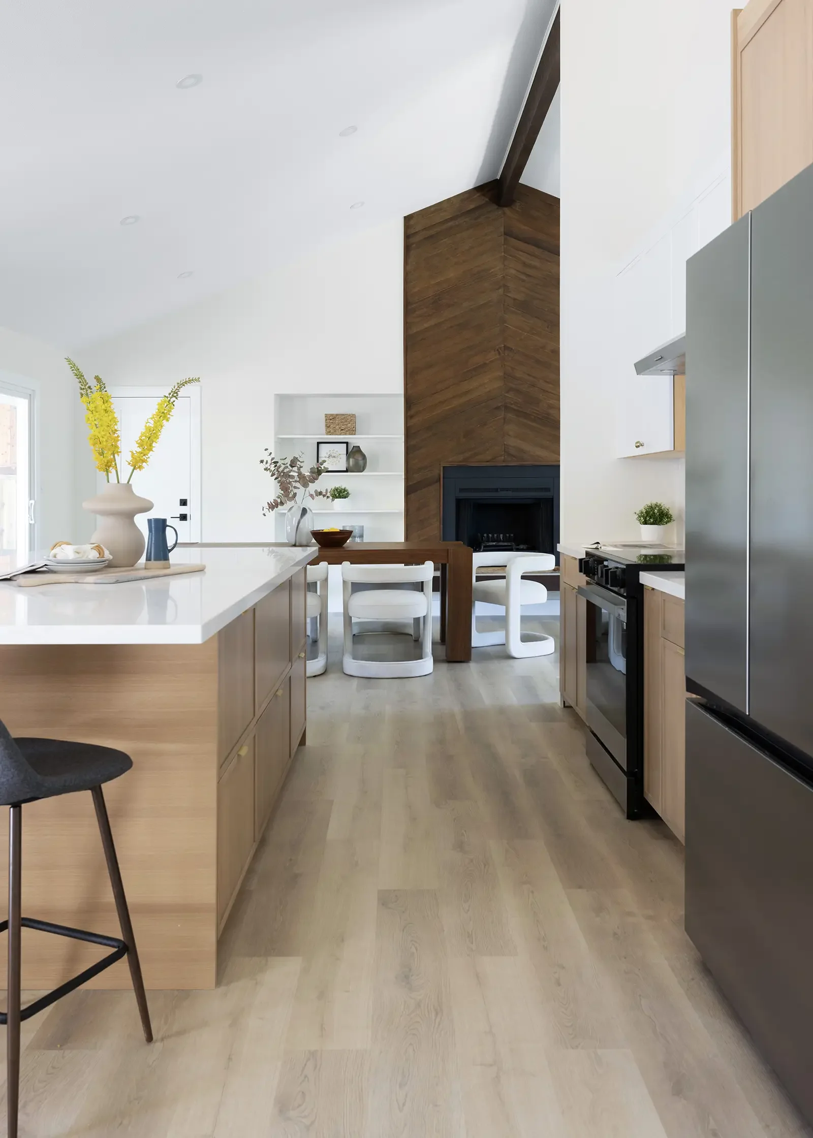 The remodel of this Moraga home blends midcentury charm with modern touches, focusing on an open-concept layout that connects the kitchen to the living areas. The kitchen, filled with natural light, features sleek cabinetry and a central island that serves as a gathering space for cooking and entertaining. Subtle nods to the midcentury, such as earthy tones and organic shapes, bring a sense of nostalgia to the otherwise contemporary design.