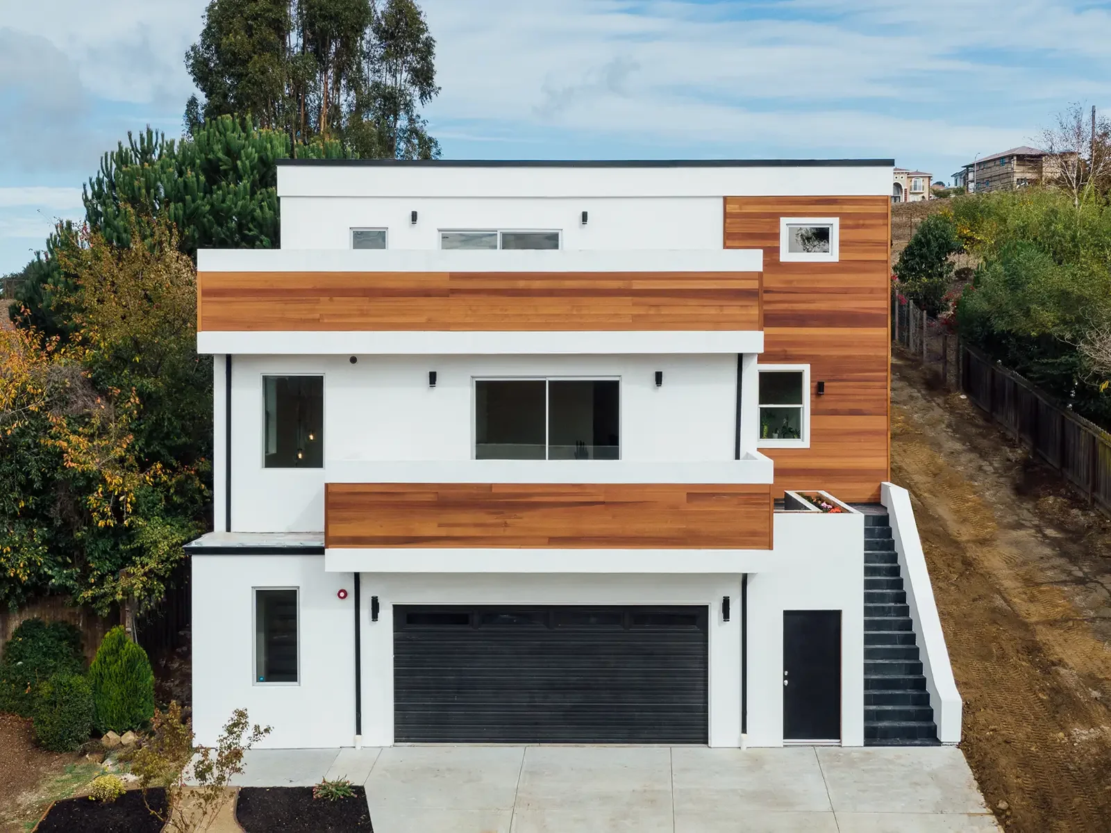 The materials of the house are ones familiar to modern Northern California Architecture - stained cedar wood siding, smooth white exterior plaster (stucco) and glass. These materials contrast well against the natural yellow/orange California grasses in the hills and the use of white plaster creates defined shadow lines to emphasize the architectural form.