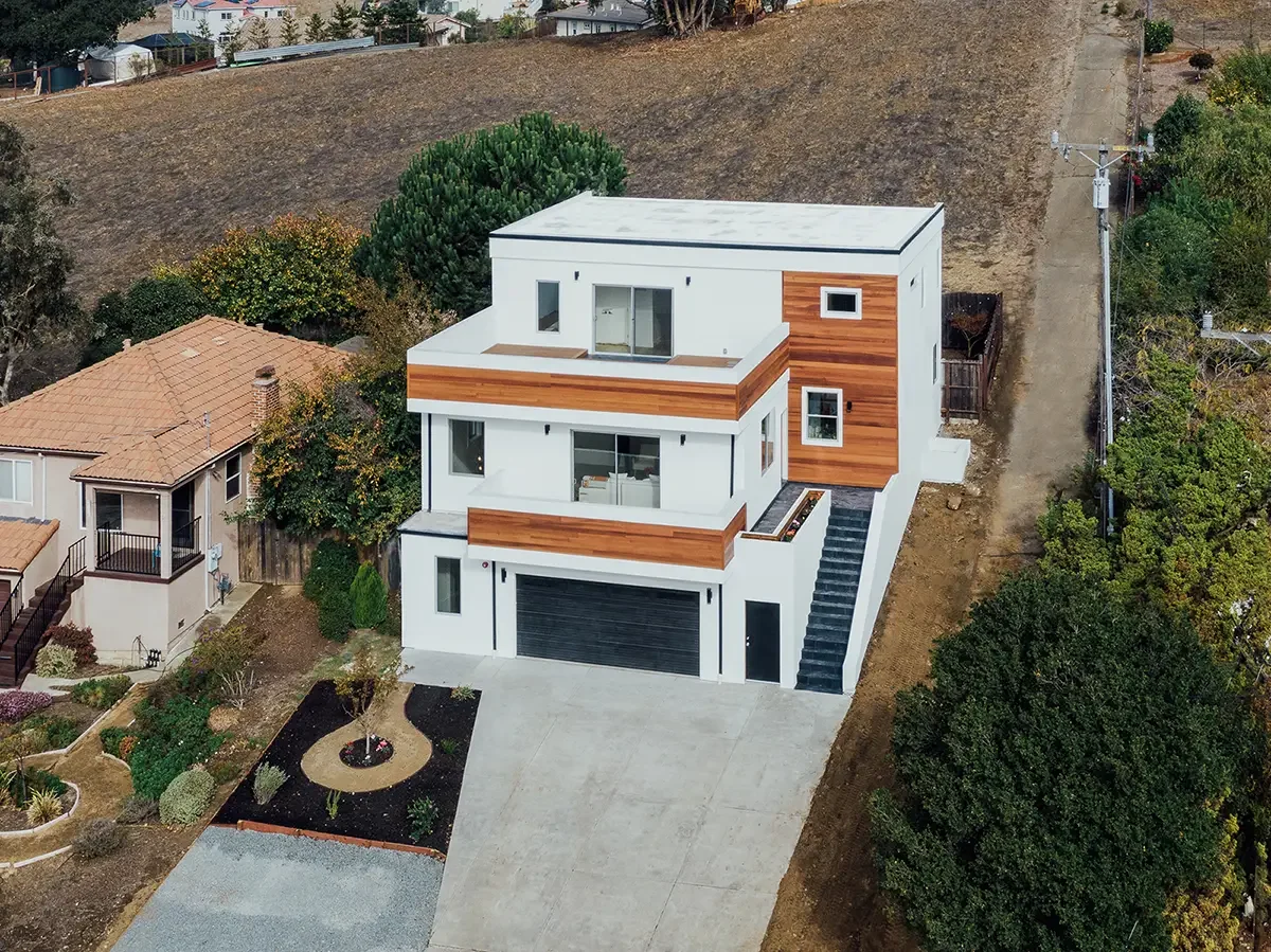 The Hayward Hills Residence sits on a south facing 5,000 square foot hillside lot with views of the San Francisco Bay and the surrounding hills.