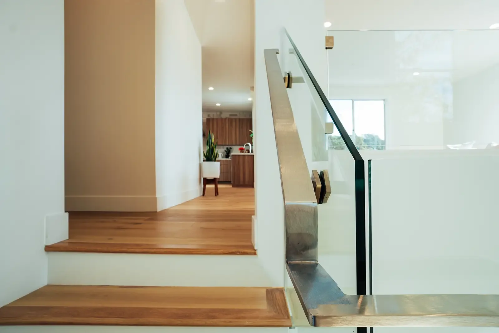 To differentiate the shifting spaces, the wood siding is stacked 2 stories high at the house entrance and horizontally wraps around the balconies. Wood decking is used on the balconies to give a comfortable feeling for outside habitation. Similar tones repeat on the interior of house with warm wood flooring, smooth white walls, white stone, and glass guardrails.
