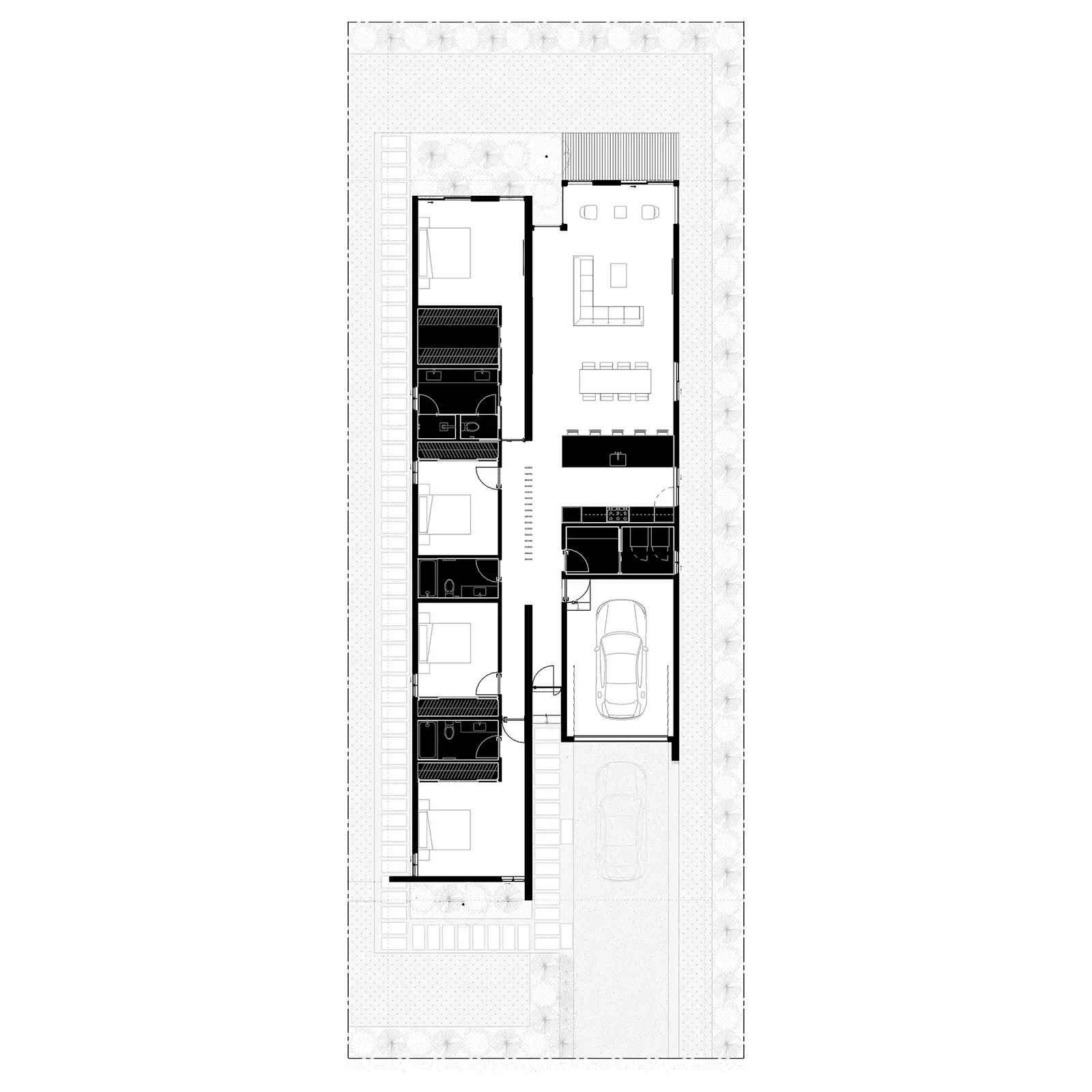 The project takes the length of the site and creates the architecture through a series of shifted planes that create two bars. The east bar (right) contains the living and family functions while the west bar (left) contains the sleeping spaces. The space between the bars frames the view of the backyard as you enter the house.