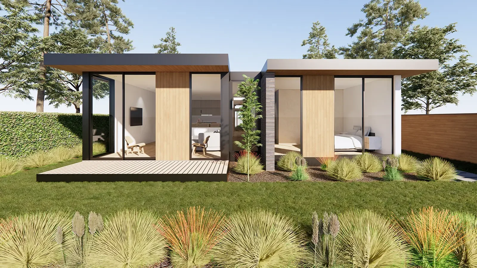 A simple palette of plaster, wood, metal and glass create the shifting planes that envelope the project while not detracting from the site landscape and heavy lined trees in The Willows neighborhood.