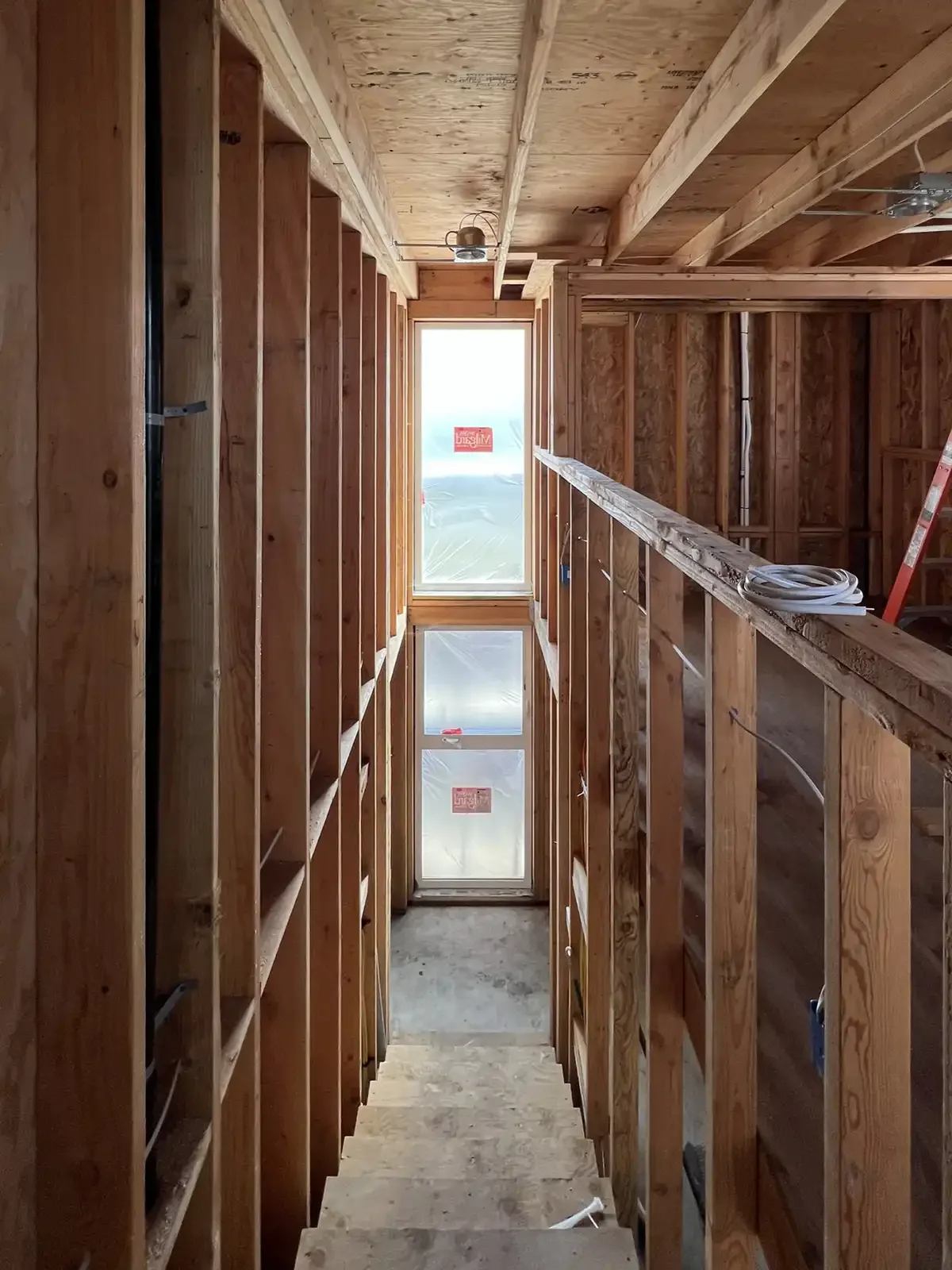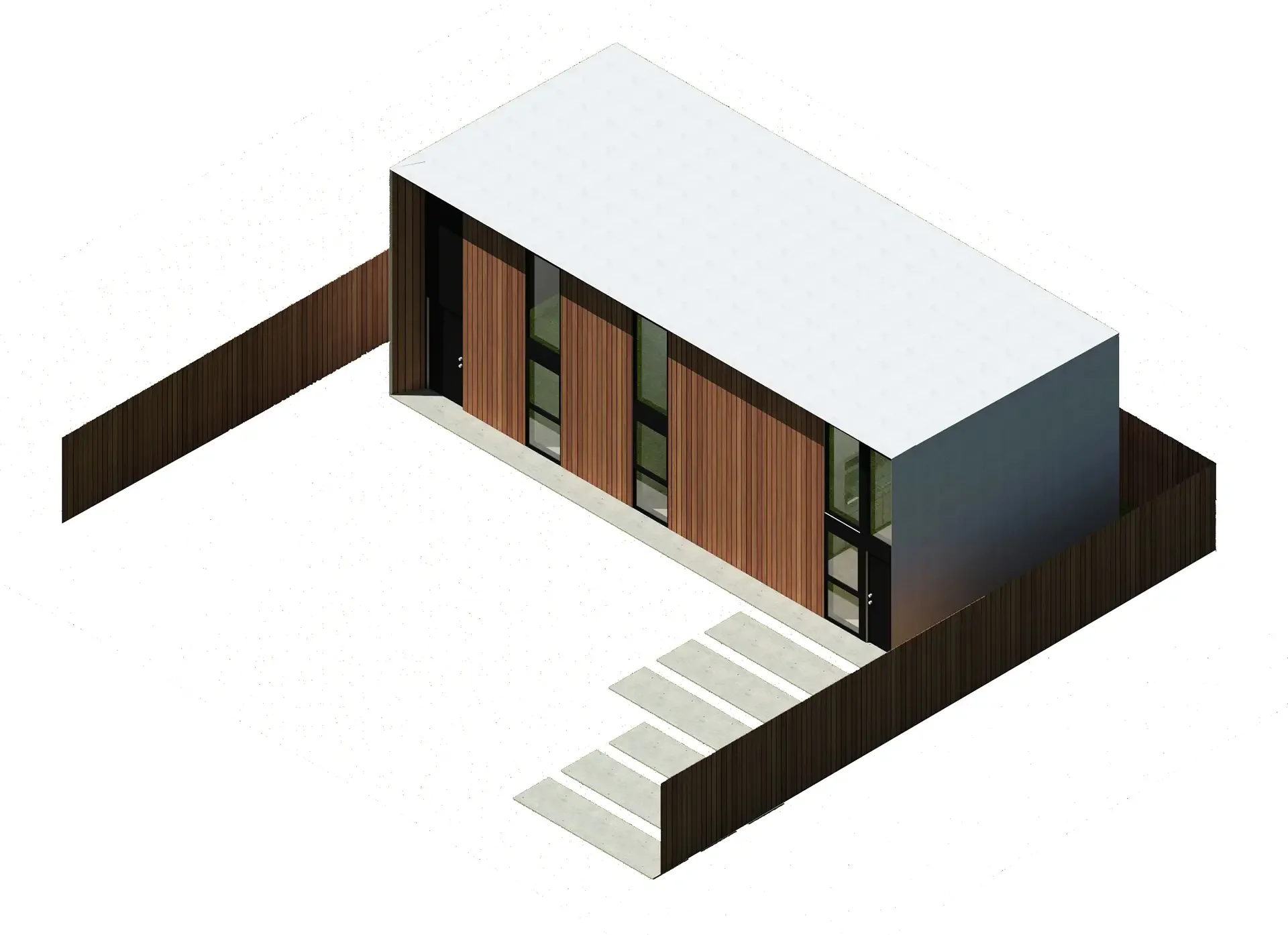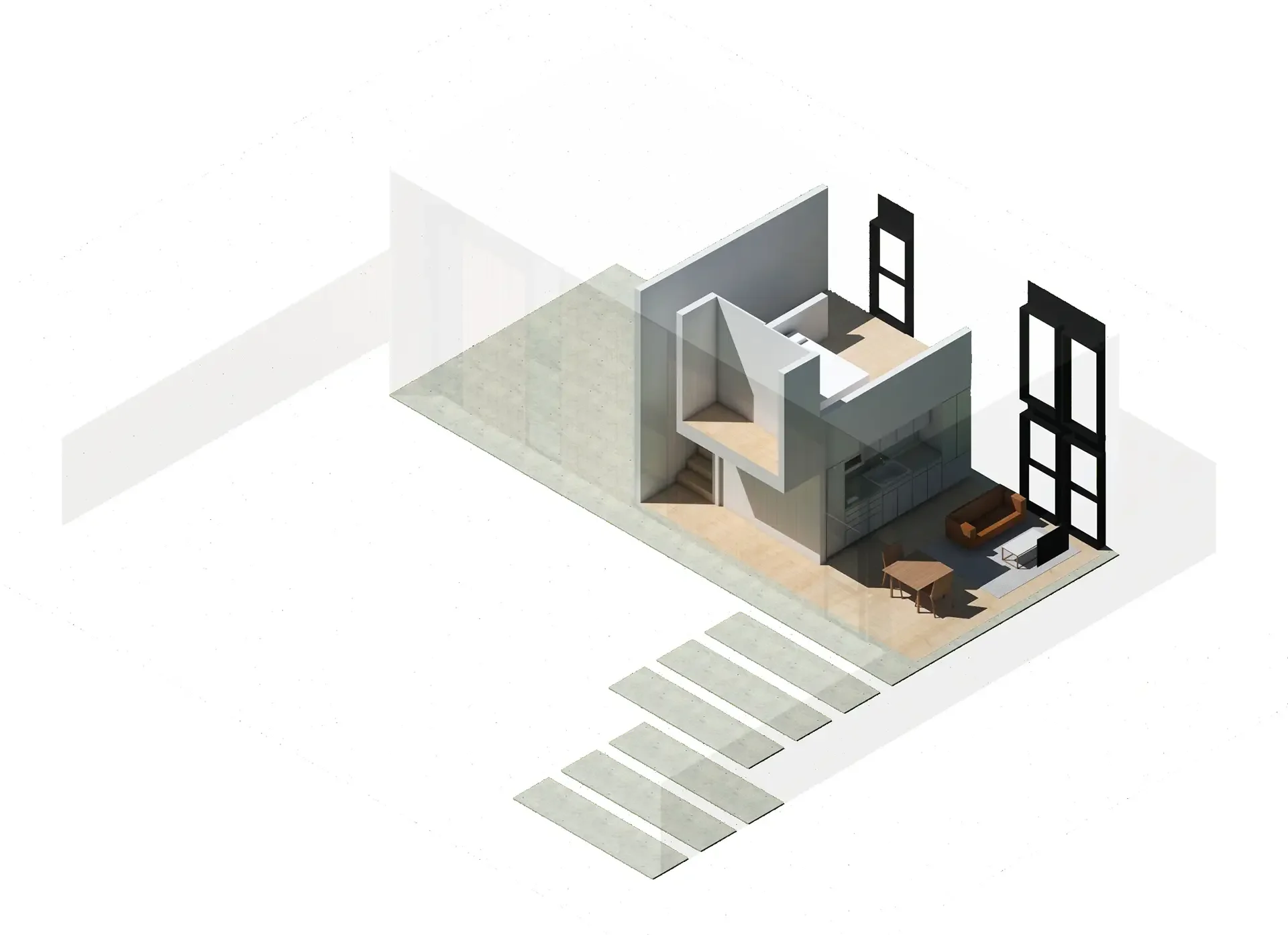 The project maxes out the allowable ADU height to create a 450 sq. ft. loft apartment in a small suburban compact form. The façade is a simple with white plaster exterior and vertical wood siding at the entrance. Floor to ceiling narrow windows emphasize the verticality of the space while also allowing for passive cooling during warm days in San Leandro. The interior is organized with 1 volume of space that contains all of the electrical, mechanical and plumbing which leaves the living and space free of flexibility.