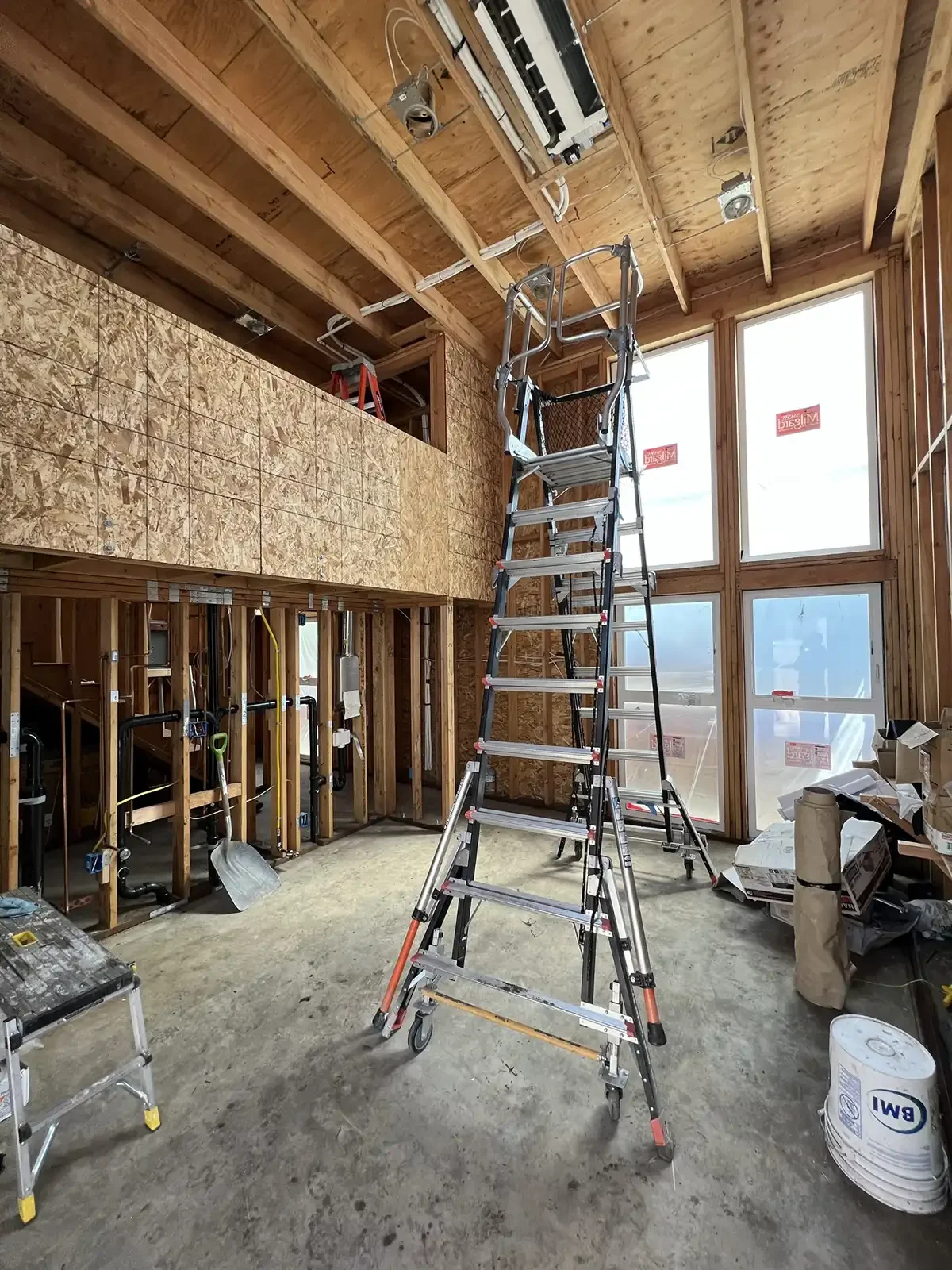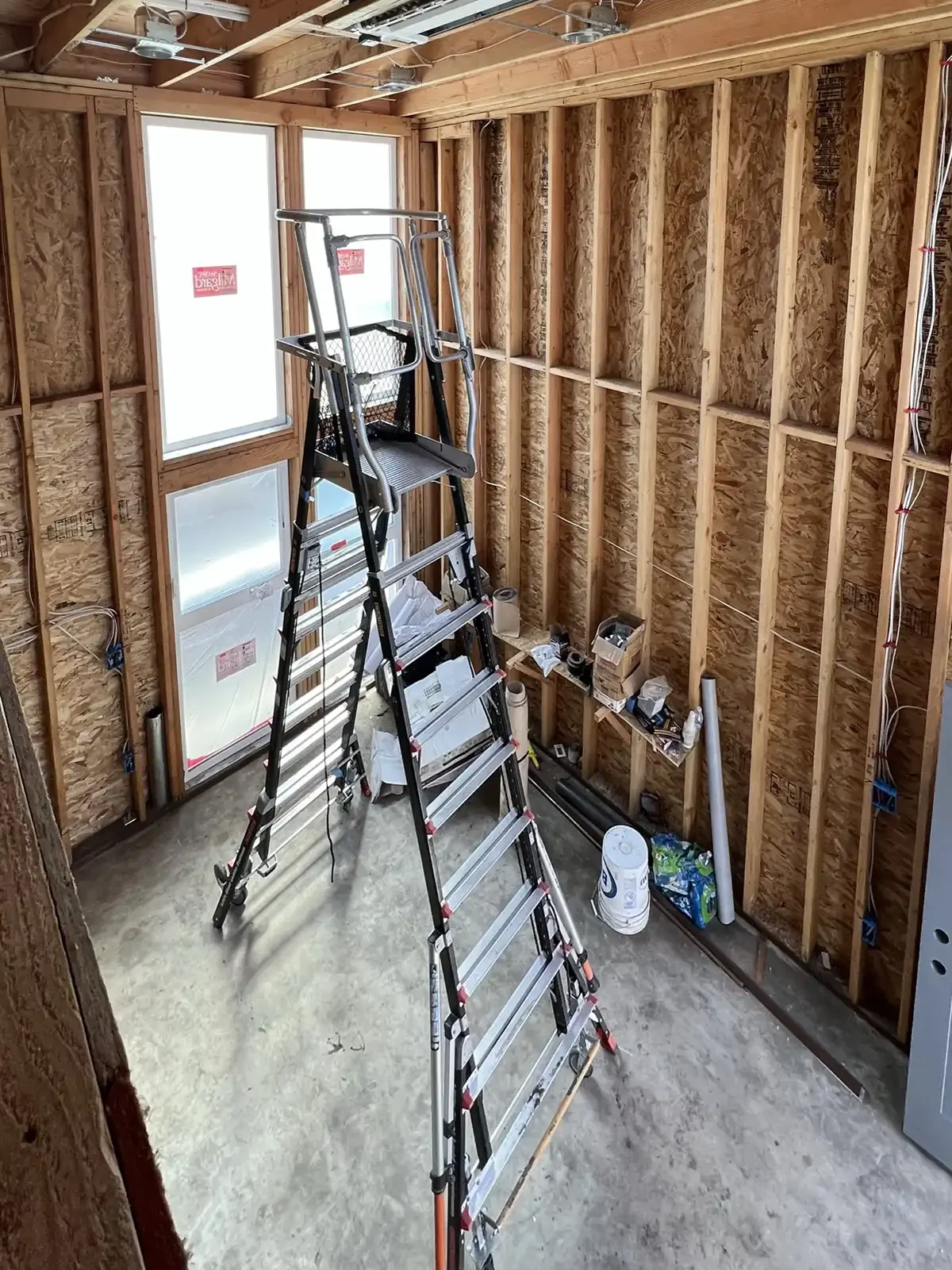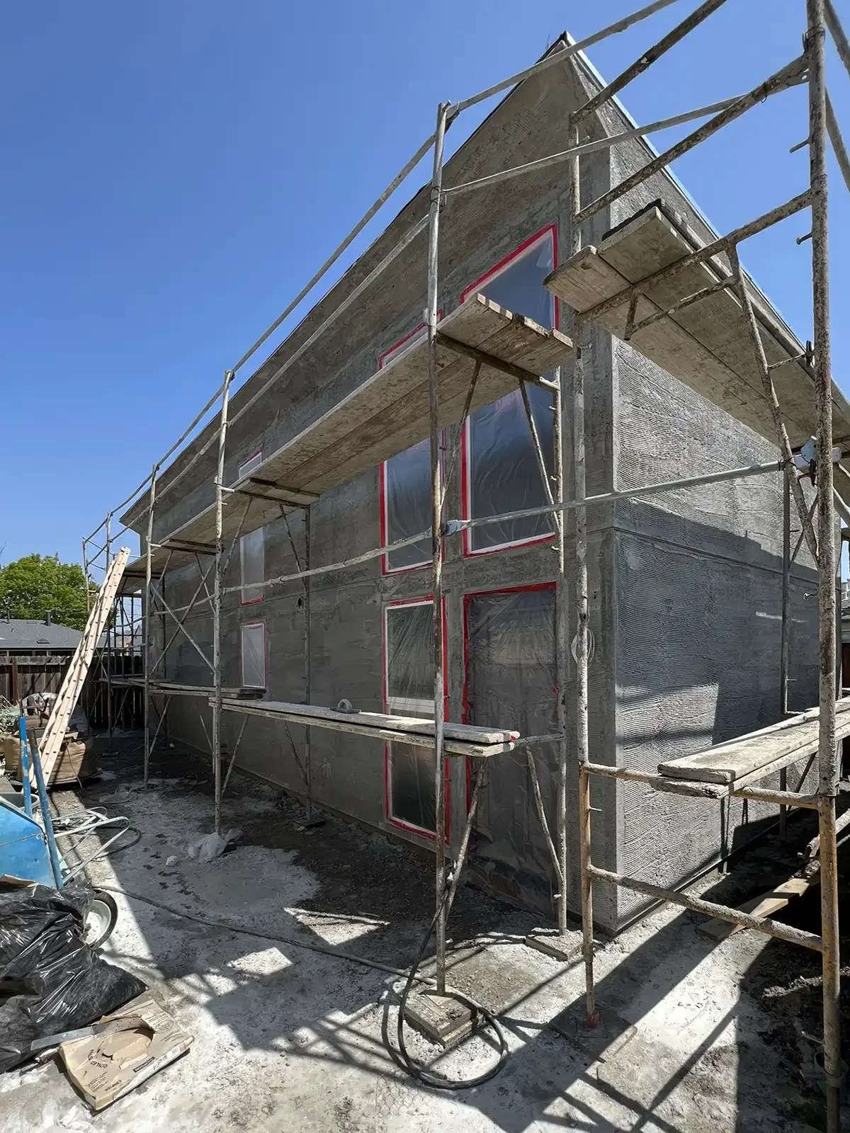 The project maxes out the allowable ADU height to create a 450 sq. ft. loft apartment in a small suburban compact form. The façade is a simple with white plaster exterior and vertical wood siding at the entrance. Floor to ceiling narrow windows emphasize the verticality of the space while also allowing for passive cooling during warm days in San Leandro. The interior is organized with 1 volume of space that contains all of the electrical, mechanical and plumbing which leaves the living and space free of flexibility.