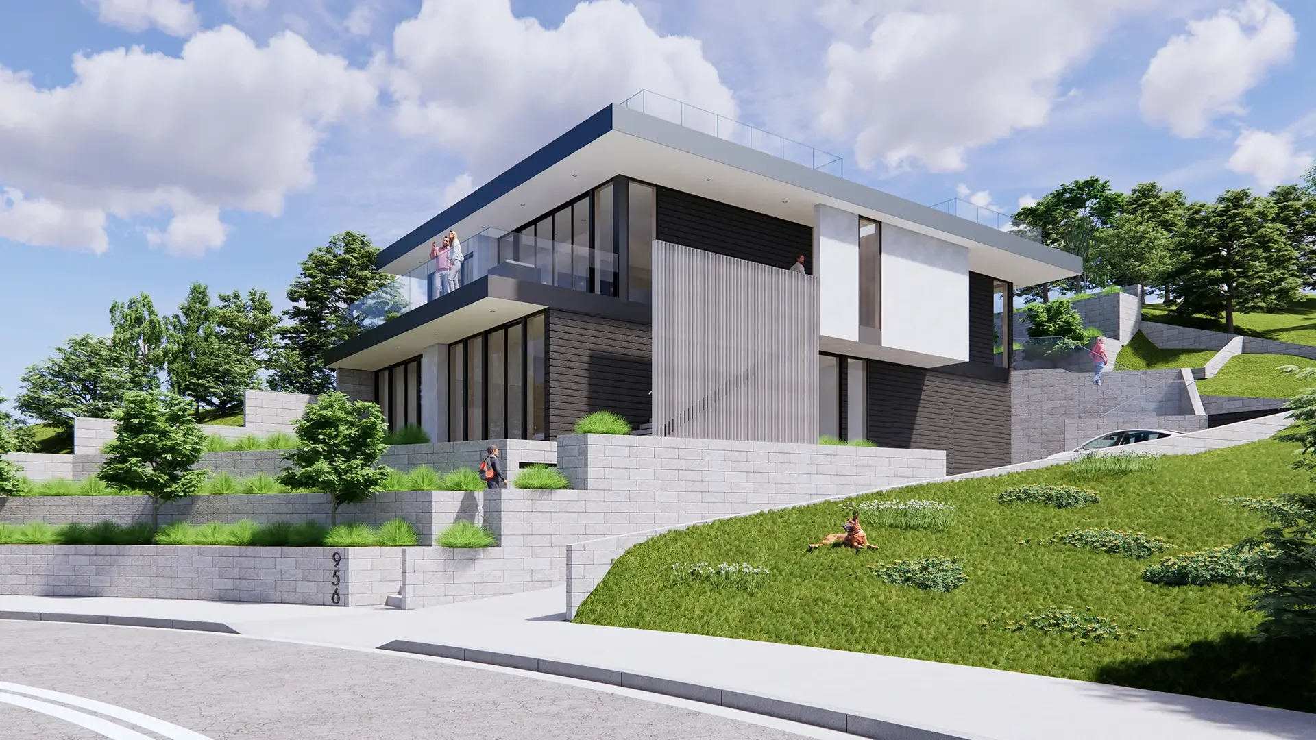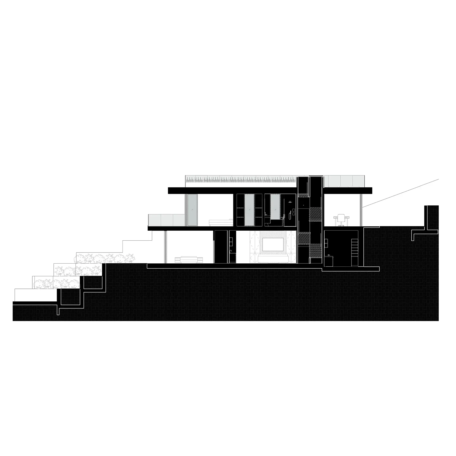 Like the terraced landscape of the site, the building terraces as you move up with horizontal bands of steel acting as sunshades, walls of glass allowing for natural light and cross ventilation, and horizontal wood creating decks at the living spaces and roof for a variety of indoor/outdoor living.