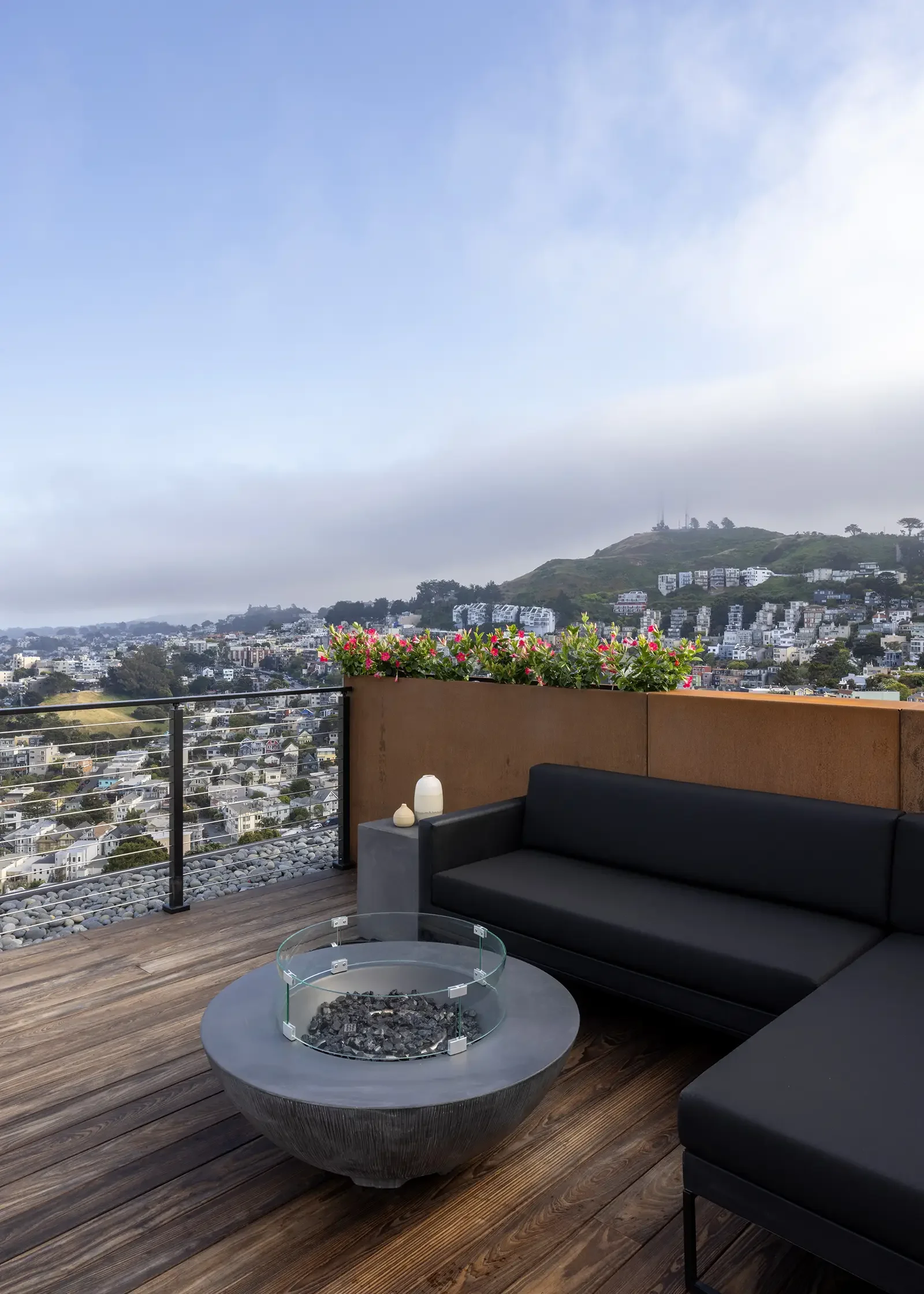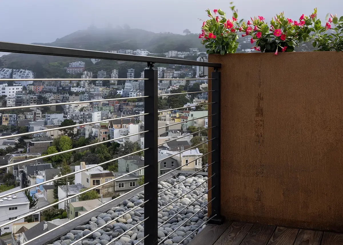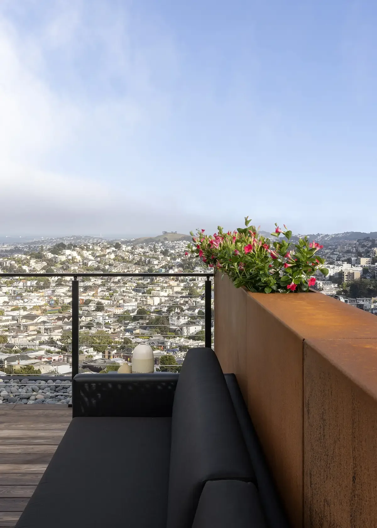 The Twin Peak Roof Top Deck captures stunning and beautiful views of the San Francisco Bay, all while providing protection from the cold and strong winds that can often be prevalent in the area. An open rod railing was thoughtfully used to ensure that the views remain unobstructed and clear. Corten steel planter boxes and walls have been utilized effectively to mask and screen unwanted views from neighbors, enhancing privacy for the users of the deck. Additionally, the stair penthouse wall is elegantly screened by a ‘Karl the Fog’ inspired metal screen, which introduces a sense of playfulness and charm to the overall design of the roof deck.