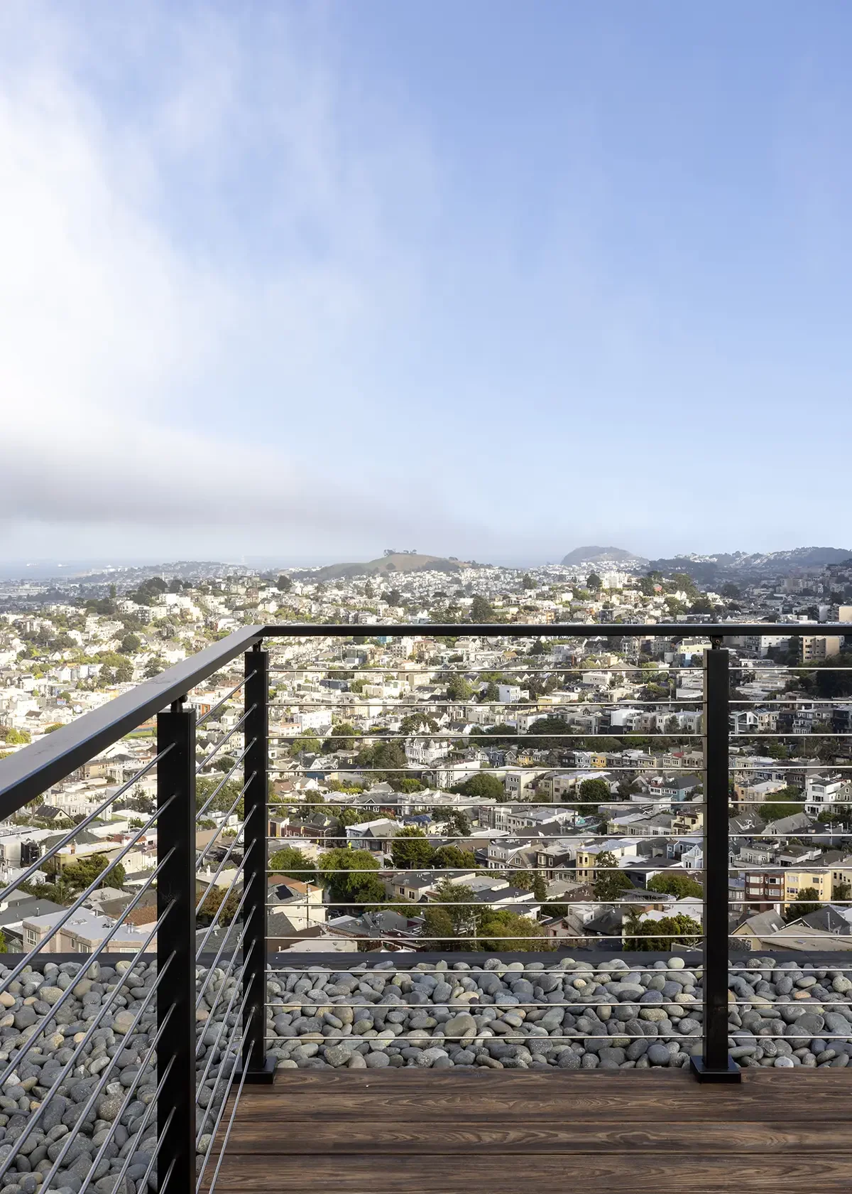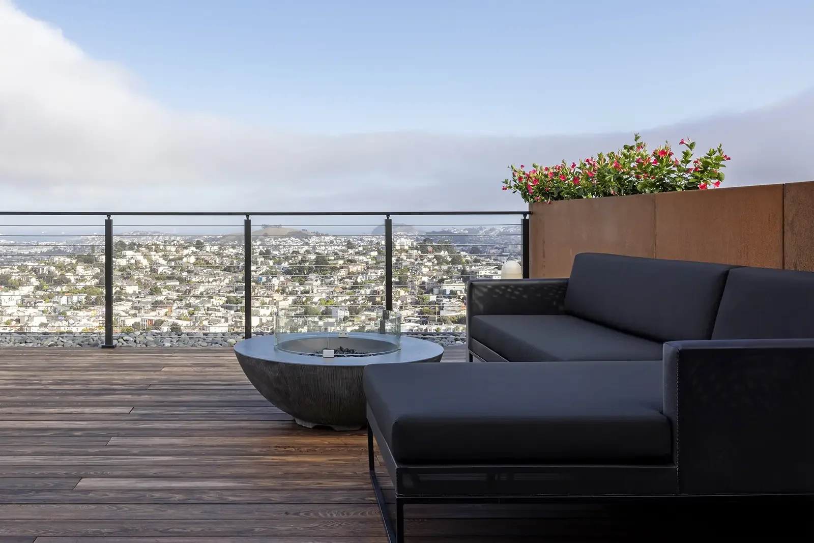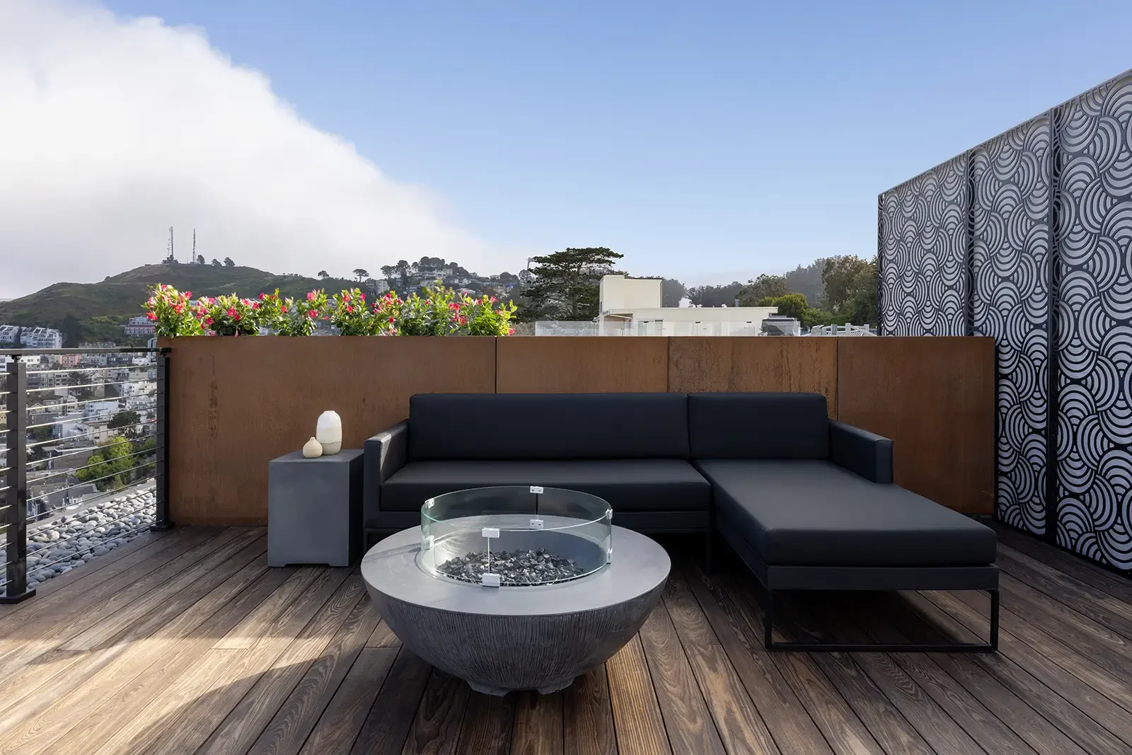 The Twin Peak Roof Top Deck captures stunning and beautiful views of the San Francisco Bay, all while providing protection from the cold and strong winds that can often be prevalent in the area. An open rod railing was thoughtfully used to ensure that the views remain unobstructed and clear. Corten steel planter boxes and walls have been utilized effectively to mask and screen unwanted views from neighbors, enhancing privacy for the users of the deck. Additionally, the stair penthouse wall is elegantly screened by a ‘Karl the Fog’ inspired metal screen, which introduces a sense of playfulness and charm to the overall design of the roof deck.