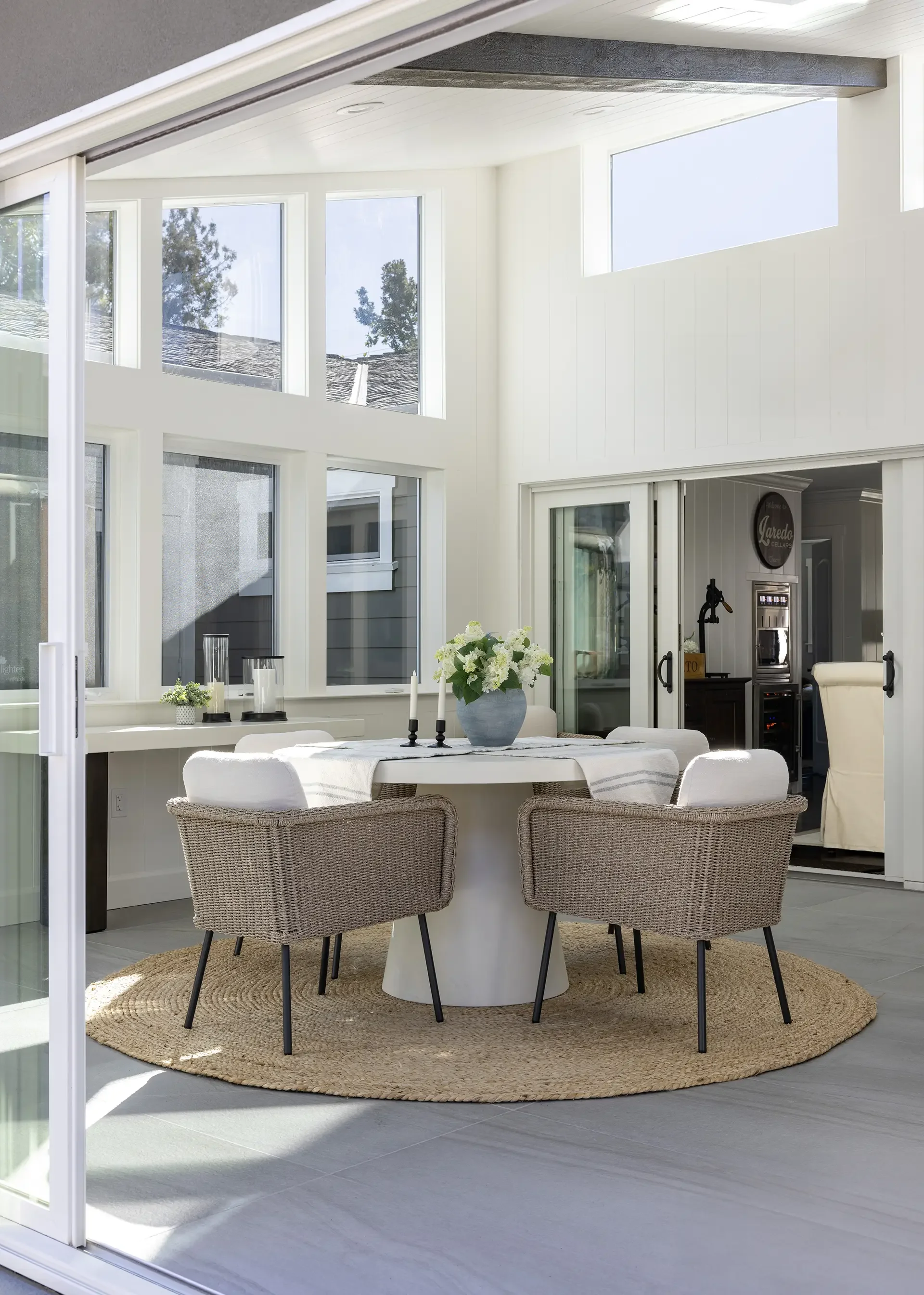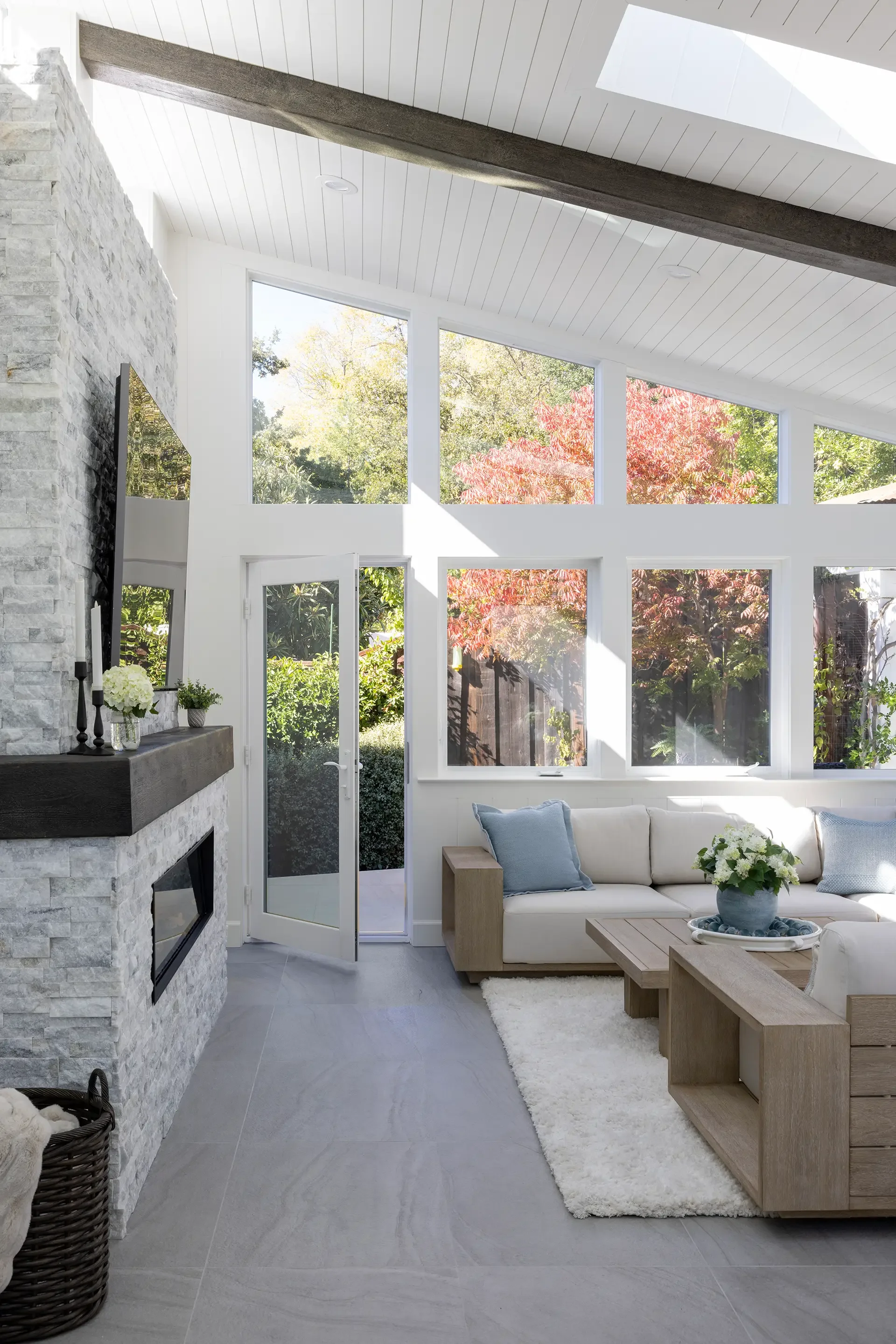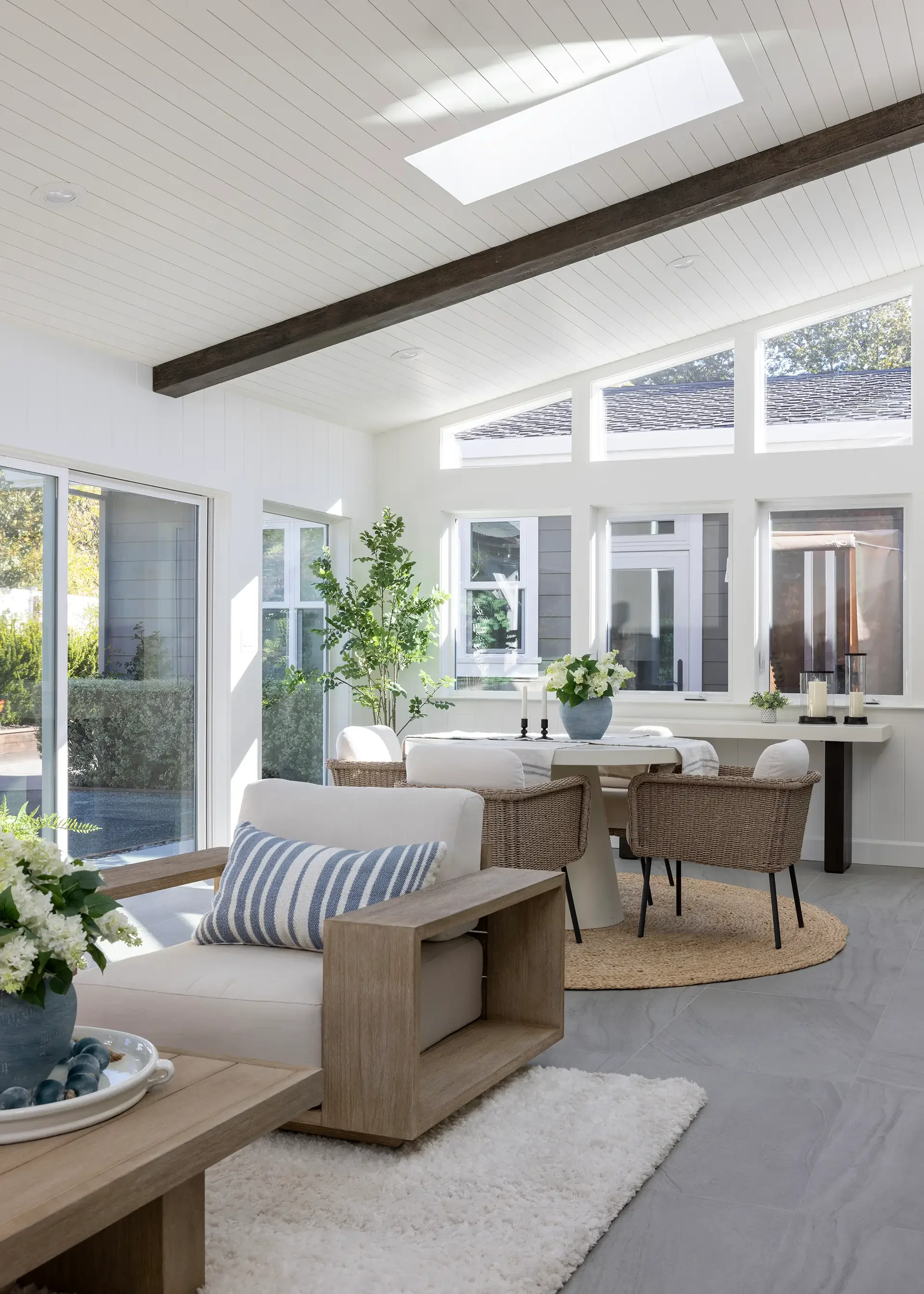 The abundance of glass openings, including skylights and clerestory windows, along with the white shiplap interior finish, beautifully invites and encapsulates natural light. These openings not only brighten the interior but also dissolve the boundary between the indoors and outdoors.