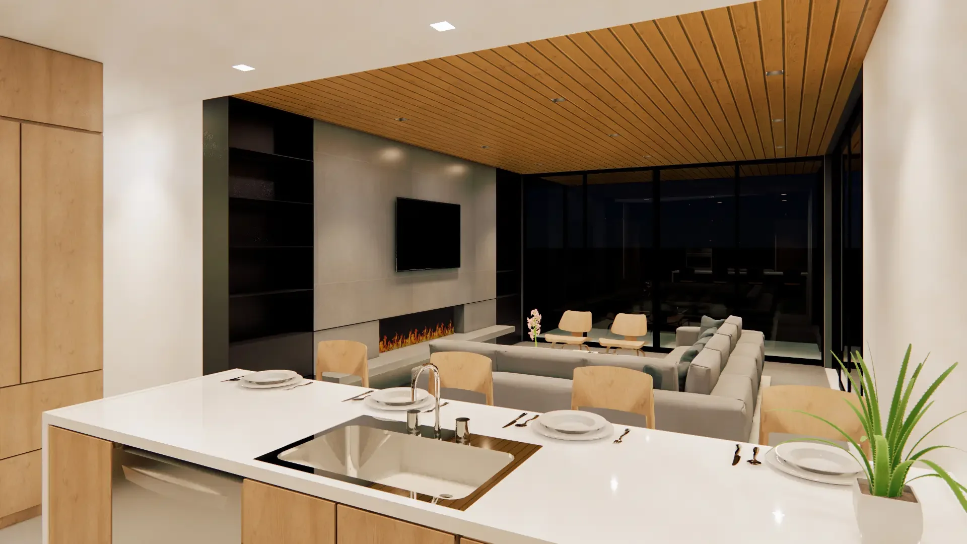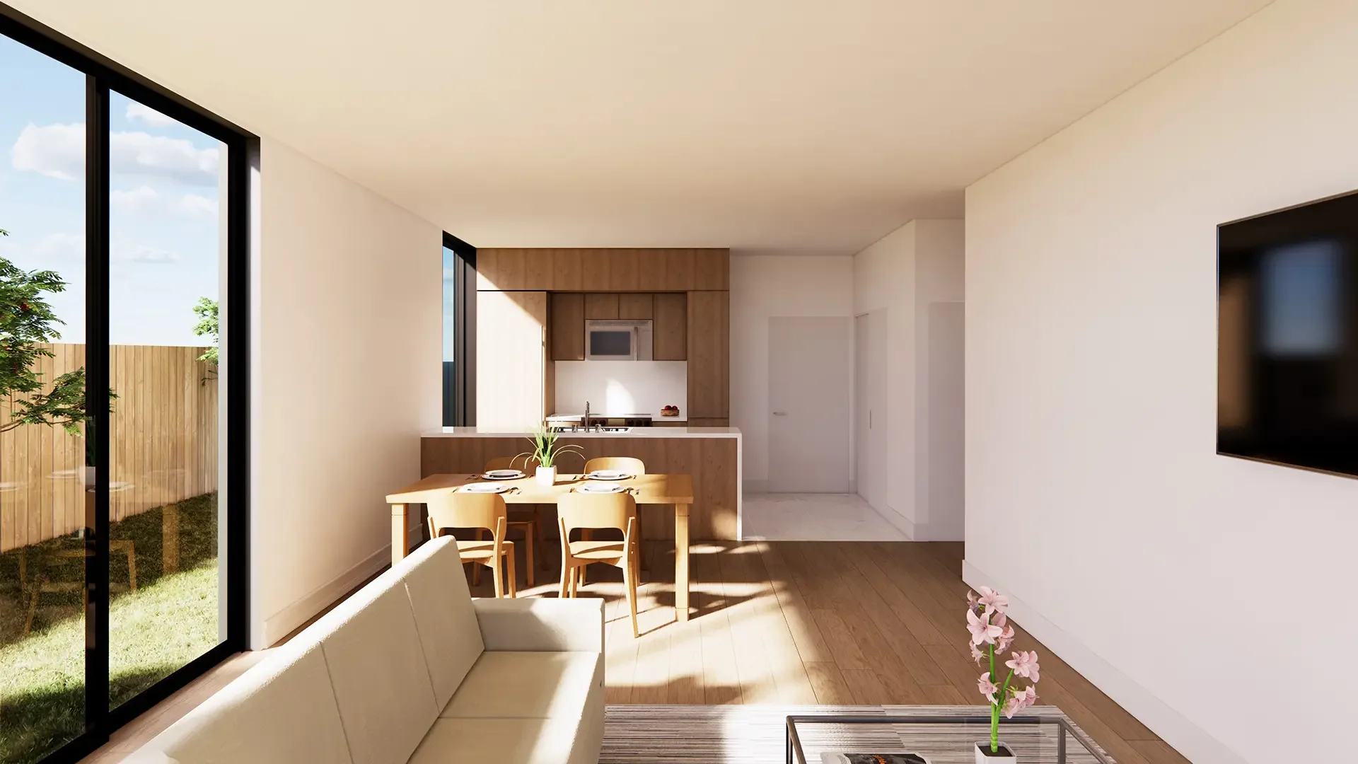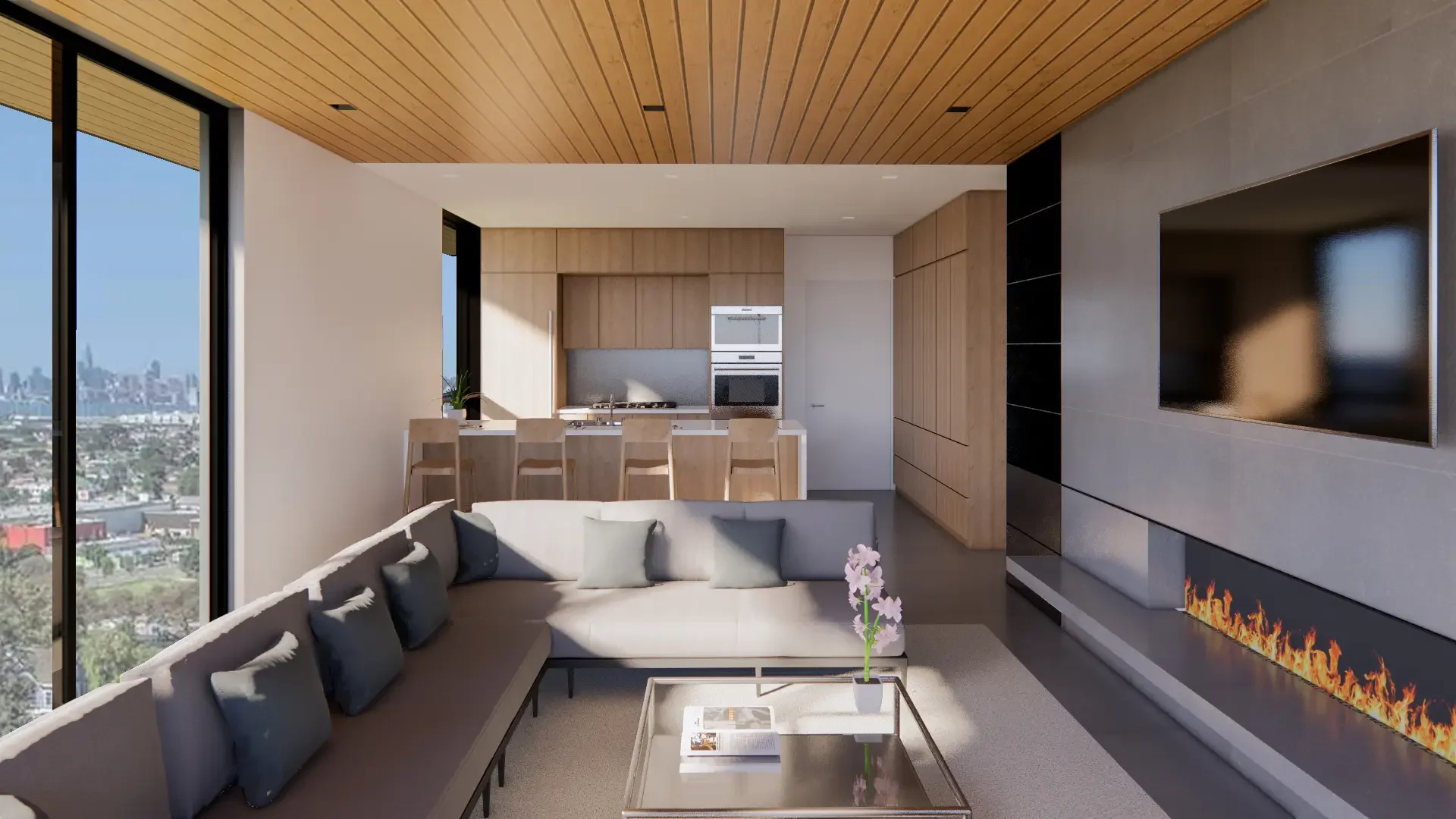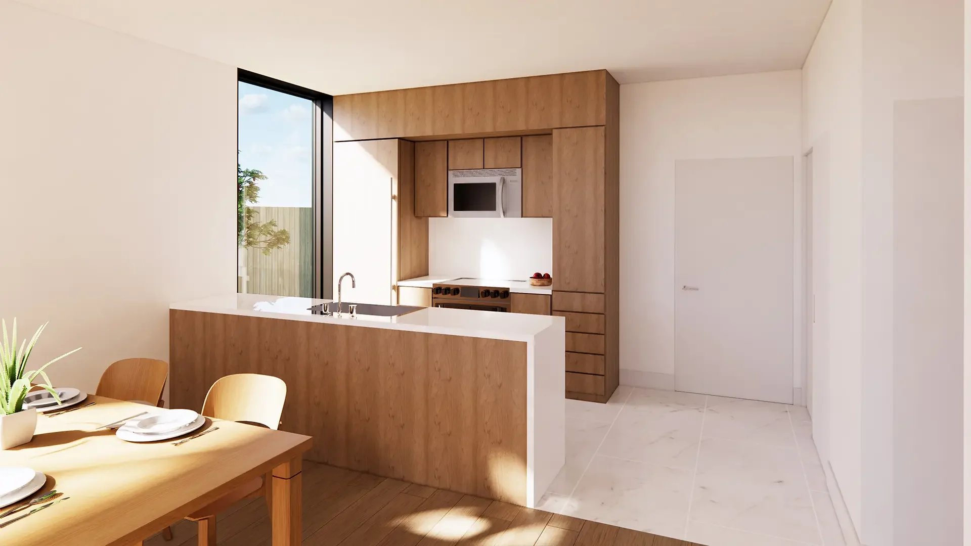 This project consists of 3 residential units stacked vertically. The units have floor to ceiling sliding glass doors on the east and south facing facades. Each unit is a 2 bedroom, 2 bathroom with a large open floor plan in the living, dining and kitchen space. The ground floor unit enjoys a large deck and 2 gardens for indoor/outdoor living. The 2nd and 3rd floor units have a large balcony on the east façade to be used for entertaining or outdoor lounging. The upper level units enjoy views of downtown Oakland to east and views of the San Francisco Bay to the West. The third level unit is reserved for the building owner which has an enlarged kitchen with a double oven, and pantry. The floors in the living spaces are warm oak with matching kitchen cabinets, the flooring in all wet areas is a white stone to contrast the wood.